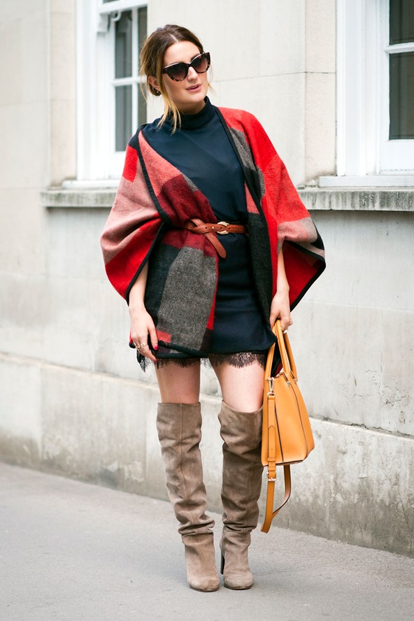 Street: London street style saw the beloved fall layered look with classic pea coats. Asymmetrical skirts are also well on the rise. Stylist Courtney Smith sported the up-and-coming blanket coat by Dunn Stores.