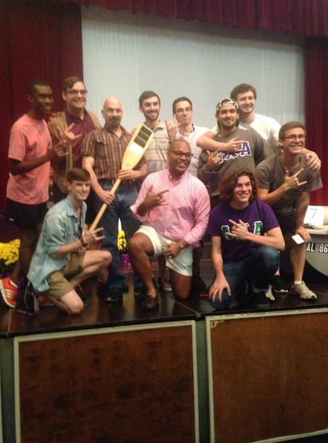 Barone poses with the oar and a group of supporting students. #BaroneOnTheBoat